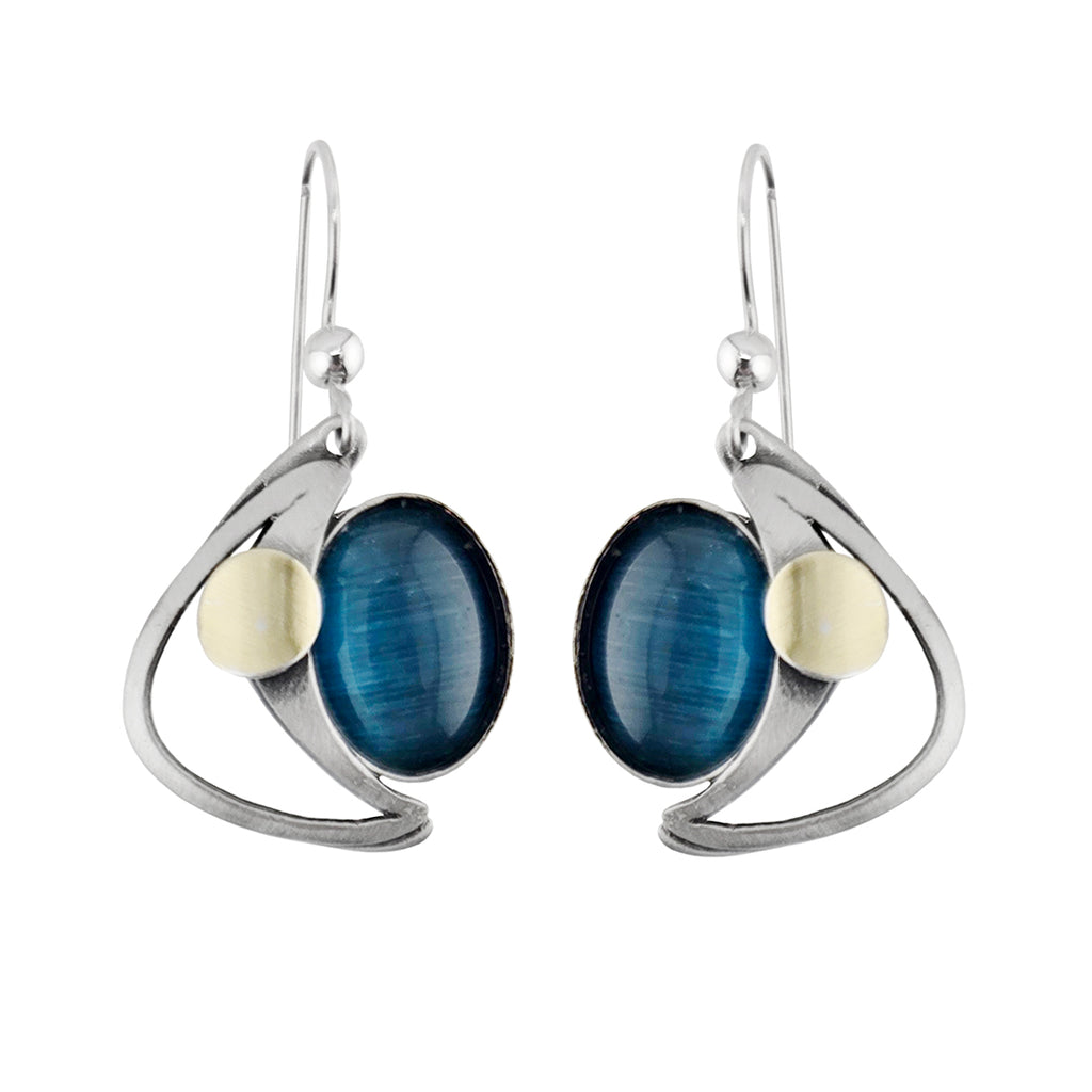 Dynamic earrings with brushed silver frame, folded gold circle and a blue glass oval cabochon. Uniquely sophisticated architectural concept handmade artisan jewelry. Designed and created by Christophe Poly in Montreal.