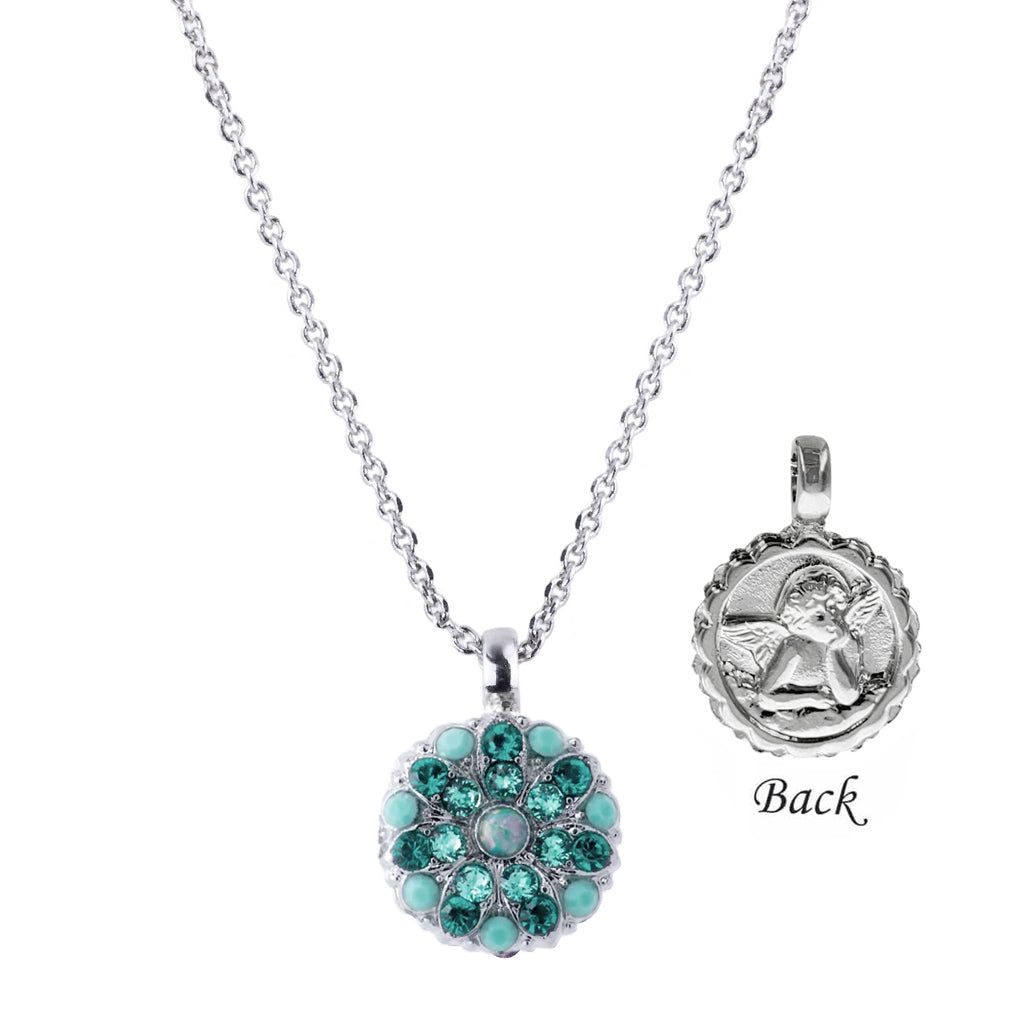 Mariana crystal Guardian Angel necklace in beautiful Turquoise blues December birthstone representing protection, courage, peace of mind. Magnificent crystal color combinations on the front with a guardian angel on the back. Mariana designs her jewelry to spiritually uplift the wearer with good energy. Her fusion of old and new, material and spirit is visible in all her designs and is the foundation, the heart and the core of her creation. Mariana jewelry is handmade in Israel with hand cut Austrian Crystals and gemstones.