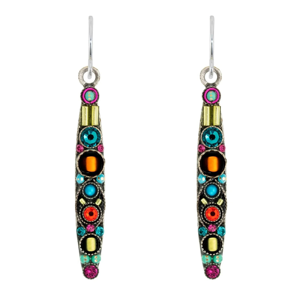 Vibrant and colorful slender crystal totem earrings from the Multi Color Collection with silver leaf pattern on the back. Firefly Mosaic's signature intricately embellished mosaics designed by Juan Carlos Chavajay Vasquez and created by skilled artisans in the Guatemala workshop.