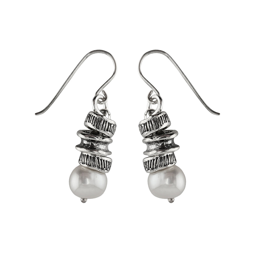 Stacked artisan sterling silver beads dancing above a luminous white pearl their textured surfaces creating dimensional interest. The textured metalwork with the timeless elegance of a glowing pearl forever appealing. Artisan handmade in Qiryat-Gat Israel surrounded by thousands of acres of national parks and agricultural villages.