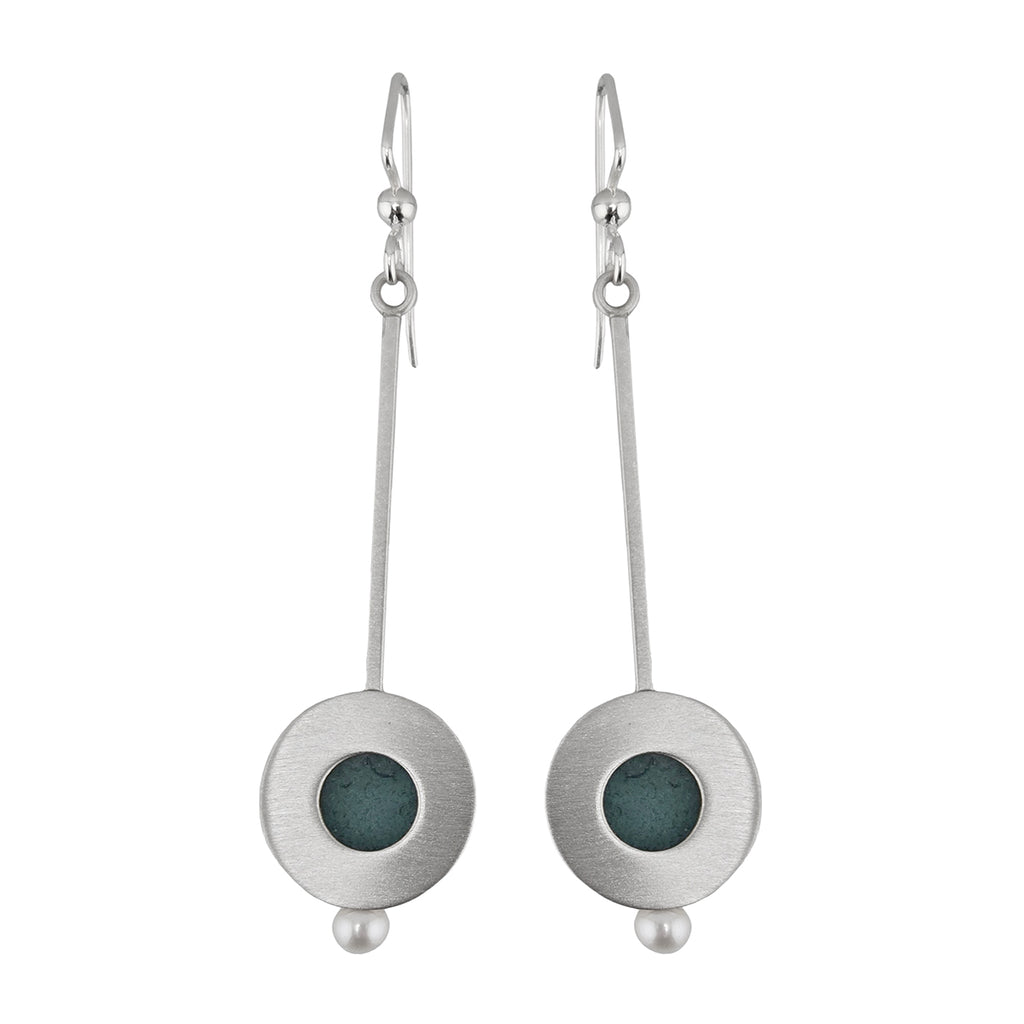 Slender brushed sterling silver rod with layered silver discs that highlight tranquil green Sea Glass, accented with a luminous white freshwater pearl. A graceful blend of coastal calm and modern elegance. Elegant, contemporary. Recipient of multiple design awards. Designed and handmade by Greg Geyer in his California studio of Mar Of Santa Barbara.