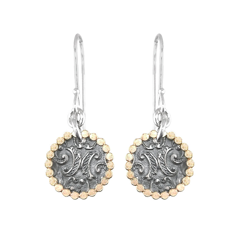 Minimalist artisan earrings feature a 14kt gold filled dotted hoop frame moving freely over oxidized silver embossed paisley motif disc creating a captivating contrast. Inspired by the endless beauty that surrounds us. Artisan handmade in the studio of Dganit Hen surrounded by the magnificent landscape of Cochav Yair, Israel.