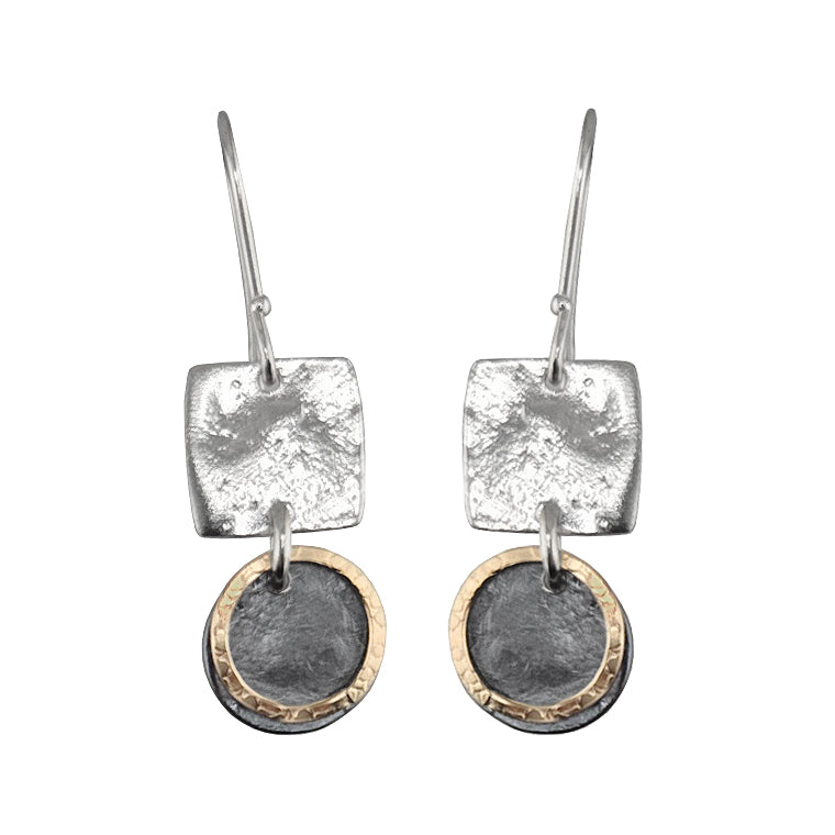 Minimalist earrings with gently textured linked elements of bright and darkened sterling accented with a golden drop hoop below adding warmth and contrast. Petite, light and easy to wear. Inspired by the endless beauty that surrounds us. Artisan handmade in the studio of Dganit Hen surrounded by the magnificent landscape of Cochav Yair, Israel.
