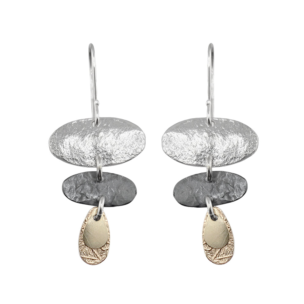 These earrings pair linked ovals of bright and deeply oxidized sterling with a softly swinging double teardrop dangle in warm gold. The textured finish catches the light beautifully creating an elegant, effortless charm. Light and easy to wear. Stamped on back with artists name. Inspired by the endless beauty that surrounds us. Artisan handmade in the studio of Dganit Hen surrounded by the magnificent landscape of Cochav Yair, Israel.