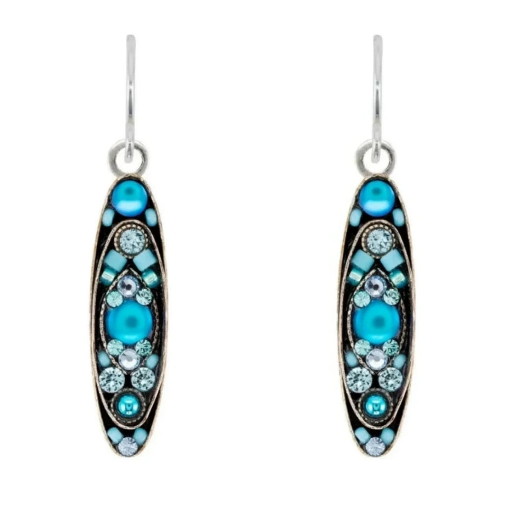 Sparkling crystal cabochon earrings with captivating blue luminescence from the Moonlight Blues Collection. With the caring words: Dream and Hope on back. Firefly Mosaic's signature intricately embellished mosaics designed by Juan Carlos Chavajay Vasquez and created by skilled artisans in the Guatemala workshop.