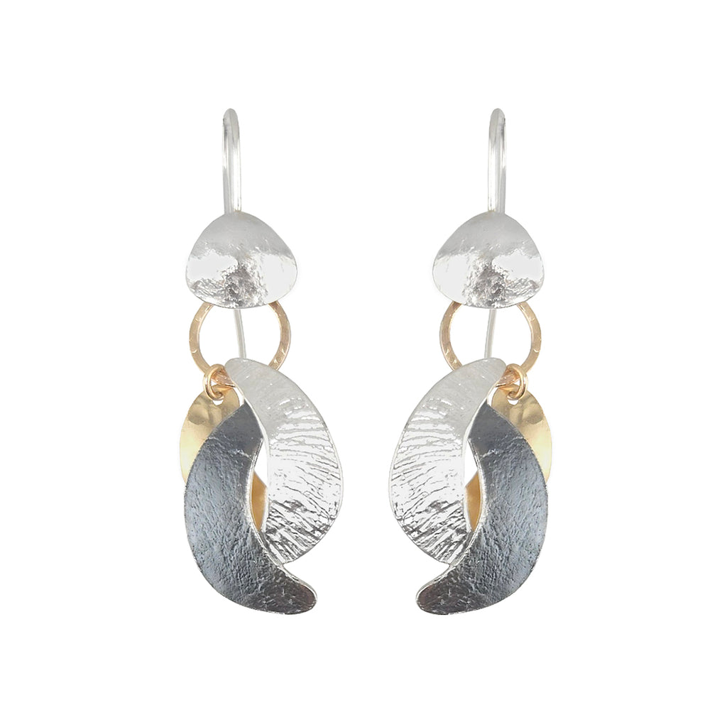 Celebrate celestial elegance with these layered crescent moon earrings, featuring a harmonious combination of textured bright silver, dark silver, and warm gold crescents that symbolize the interplay of light and shadow. Gracefully suspended from a textured golden open hoop. Inspired by the endless beauty that surrounds us. Artisan handmade in the studio of Dganit Hen surrounded by the magnificent landscape of Cochav Yair, Israel.
