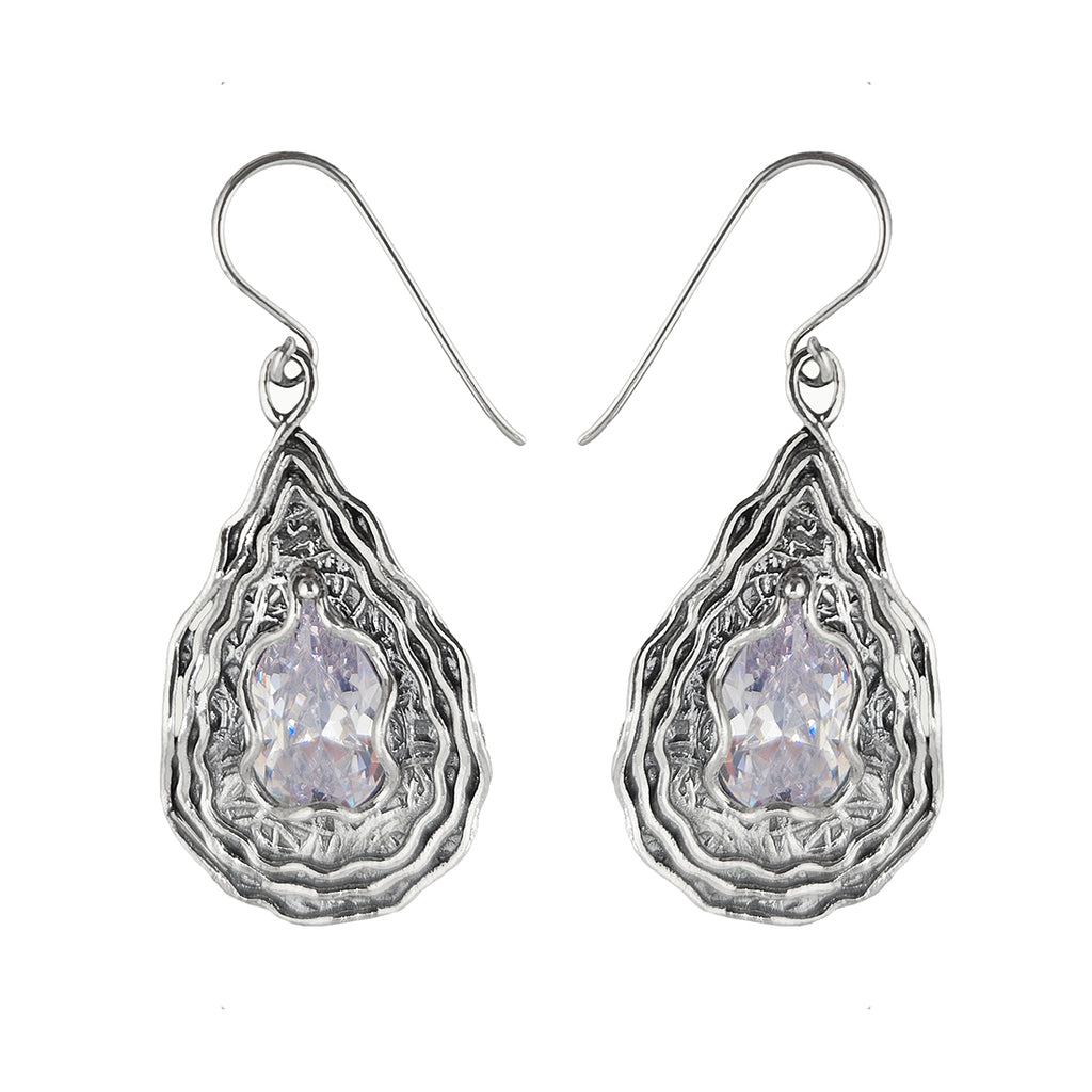 Crafted from sterling silver, these teardrop earrings feature a brilliantly faceted crystal centerpiece set within a dynamic, undulating wave motif. The radiant stone catches light beautifully, while the flowing metalwork design adds sophisticated movement and dimension. Stamped with artists name and Israel on back. Artisan handmade in Qiryat-Gat Israel surrounded by thousands of acres of national parks and agricultural villages.