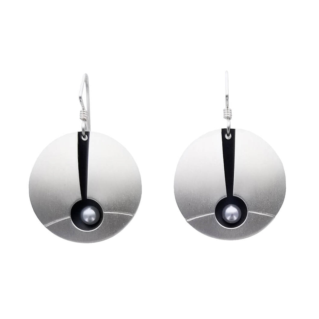 Brushed sterling silver open circle earrings softly domed on both sides with deeply oxidized sterling interior demurely highlighting a single white Pearl. Mar Of Santa Barbara recipient of multiple design awards. Each piece is meticulously designed and handmade in the Santa Barbara, California studio of Greg Geyer.