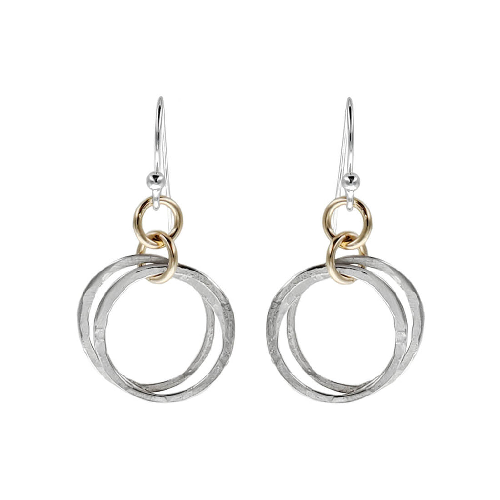 Featuring two hand hammered bright sterling silver hoops suspended from 14kt gold filled links creating contrast and warmth. Great artisan mixed metal hoop earrings that go with every outfit. Artisan handmade in the USA.