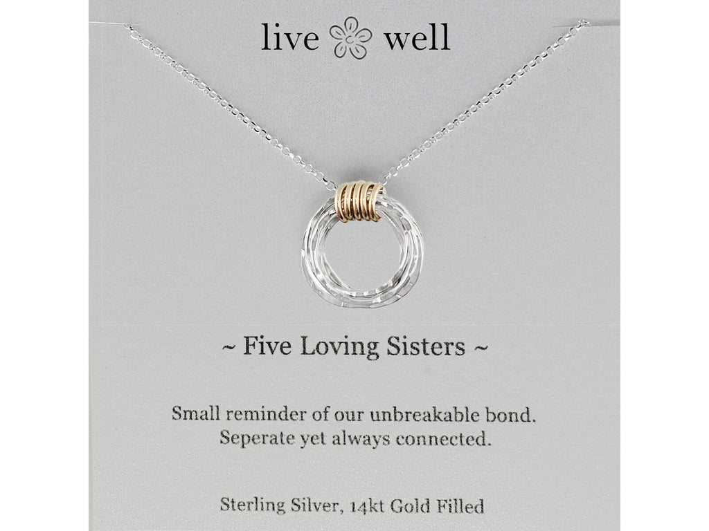 Five Loving Sisters necklace with five sterling silver hand hammered hoops separate yet always connected is a heartfelt expression of the powerful bond of sisterhood. A meaningful gift to acknowledge and celebrate the impactful and unique relationship that exists between sisters, girlfriends, coworkers. Live Well a collection of inspirational and meaningful jewelry artisan handmade in the USA.