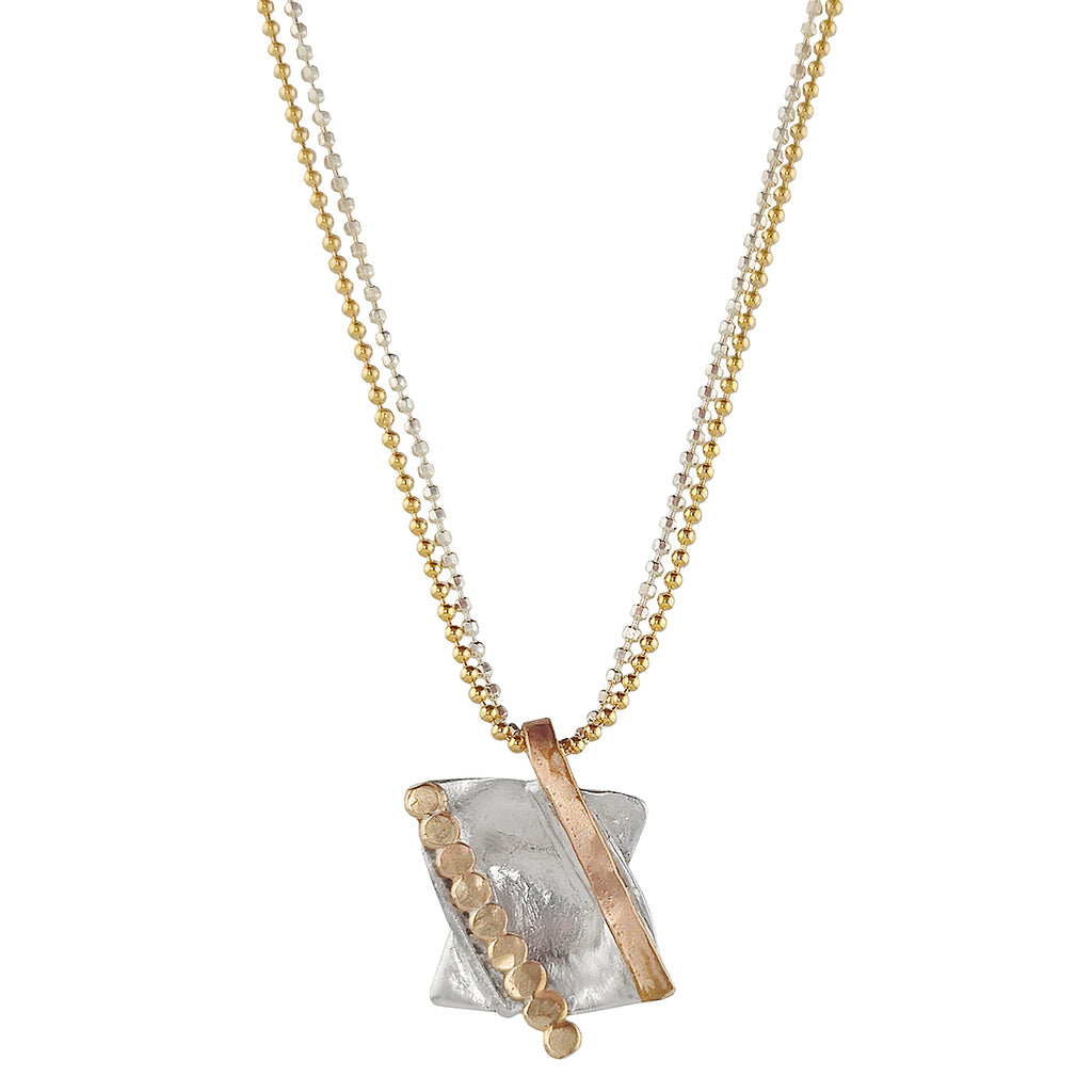 This pendant features a Star of David formed with elegant sculpted folds enhanced by two golden bars that evoke beams of light bridging history. The design creates a contemporary and balanced interpretation of this timeless symbol. Easy toggle clasp. Inspired by the endless beauty that surrounds us. Artisan handmade in the studio of Dganit Hen surrounded by the magnificent landscape of Cochav Yair, Israel.