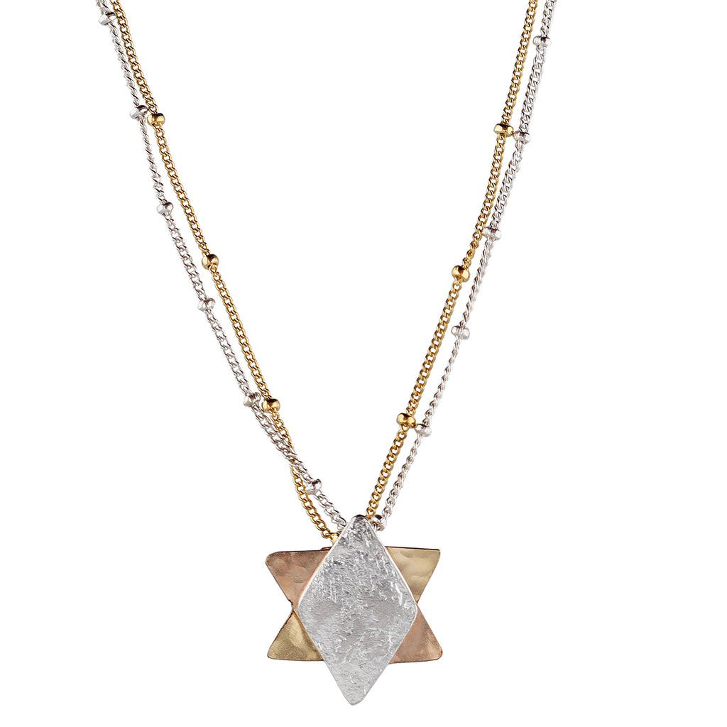 An inspired Star of David formed with a textured sterling diamond shape layered on golden points merging contemporary geometric style with enduring symbolic meaning that reflects balance and radiance. Suspended from twin beaded silver and gold chains creating a look of layered light and meaning. Easy toggle clasp. Inspired by the endless beauty that surrounds us. Artisan handmade in the studio of Dganit Hen surrounded by the magnificent landscape of Cochav Yair, Israel.