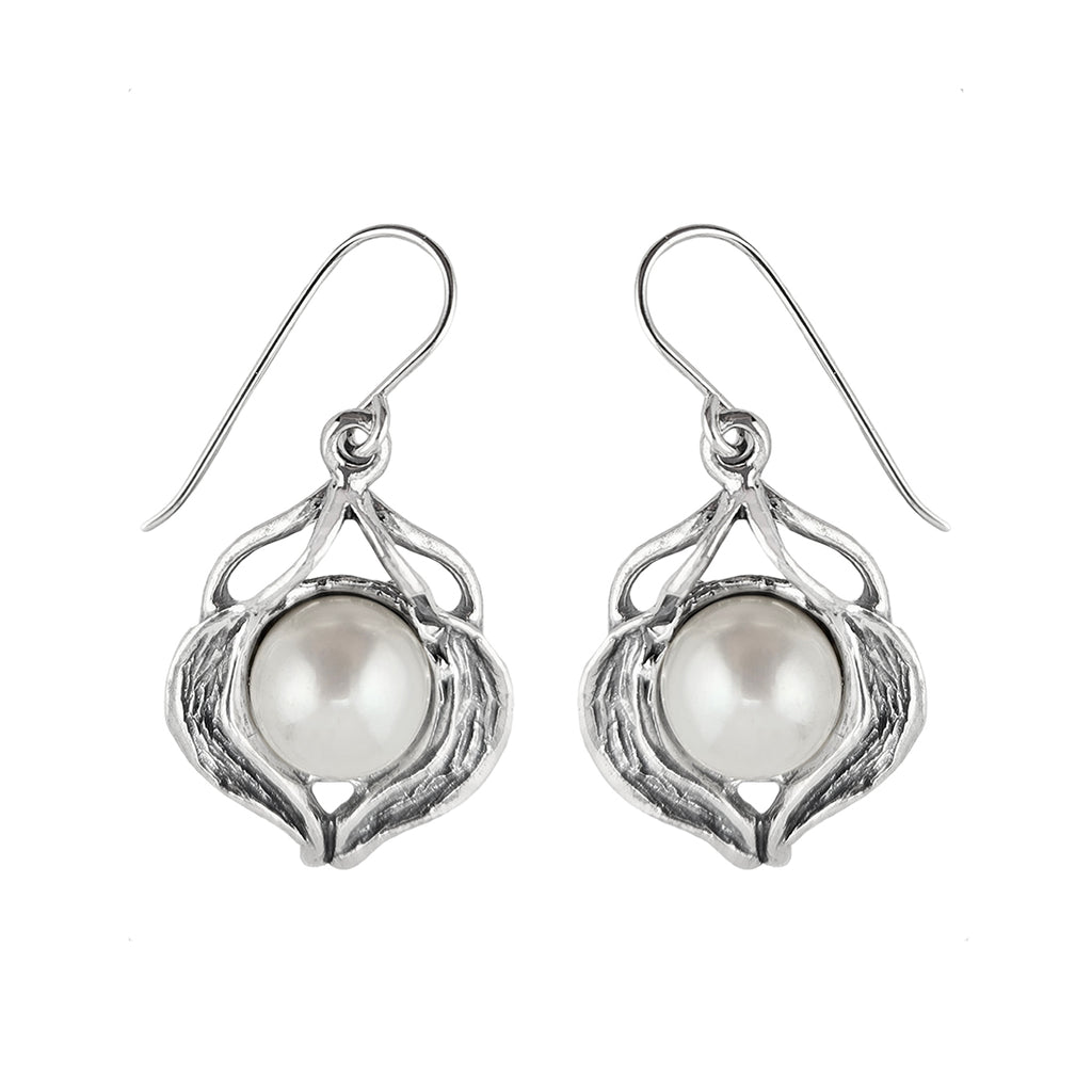 Sterling silver blossoms cradle a single luminous white Freshwater Pearl. Stamped with artists name and Israel on back. Artisan handmade in Qiryat-Gat Israel surrounded by thousands of acres of national parks and agricultural villages.