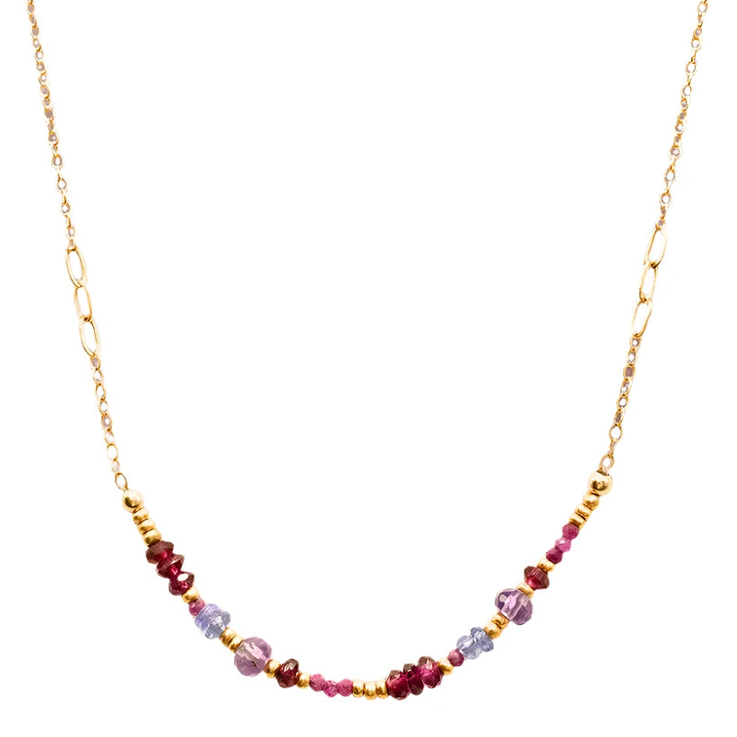 A dreamy collection of Ruby, Rhodolite, Tanzanite, and Amethyst gemstones strung onto a 14k gold filled chain with three larger gold links that create a beautiful contrast adding visual interest and elegance to this timeless piece. Organic designs with an artisanal essence. Handmade in the J and I Philadelphia studio of Jessica and Ian Gibson.