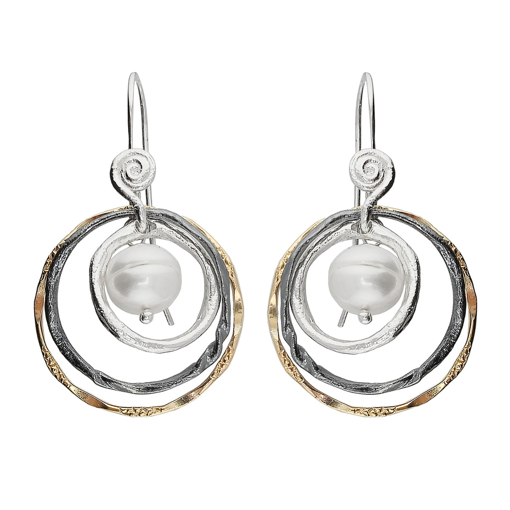 Triple handcrafted hoops combine bright and oxidized sterling silver with a beautifully textured outer gold hoop, enhanced by a white Freshwater Pearl crowned with a silver spiral. Dimensional, lightweight and with movement. Inspired by the endless beauty that surrounds us. Artisan handmade in the studio of Dganit Hen surrounded by the magnificent landscape of Cochav Yair, Israel.