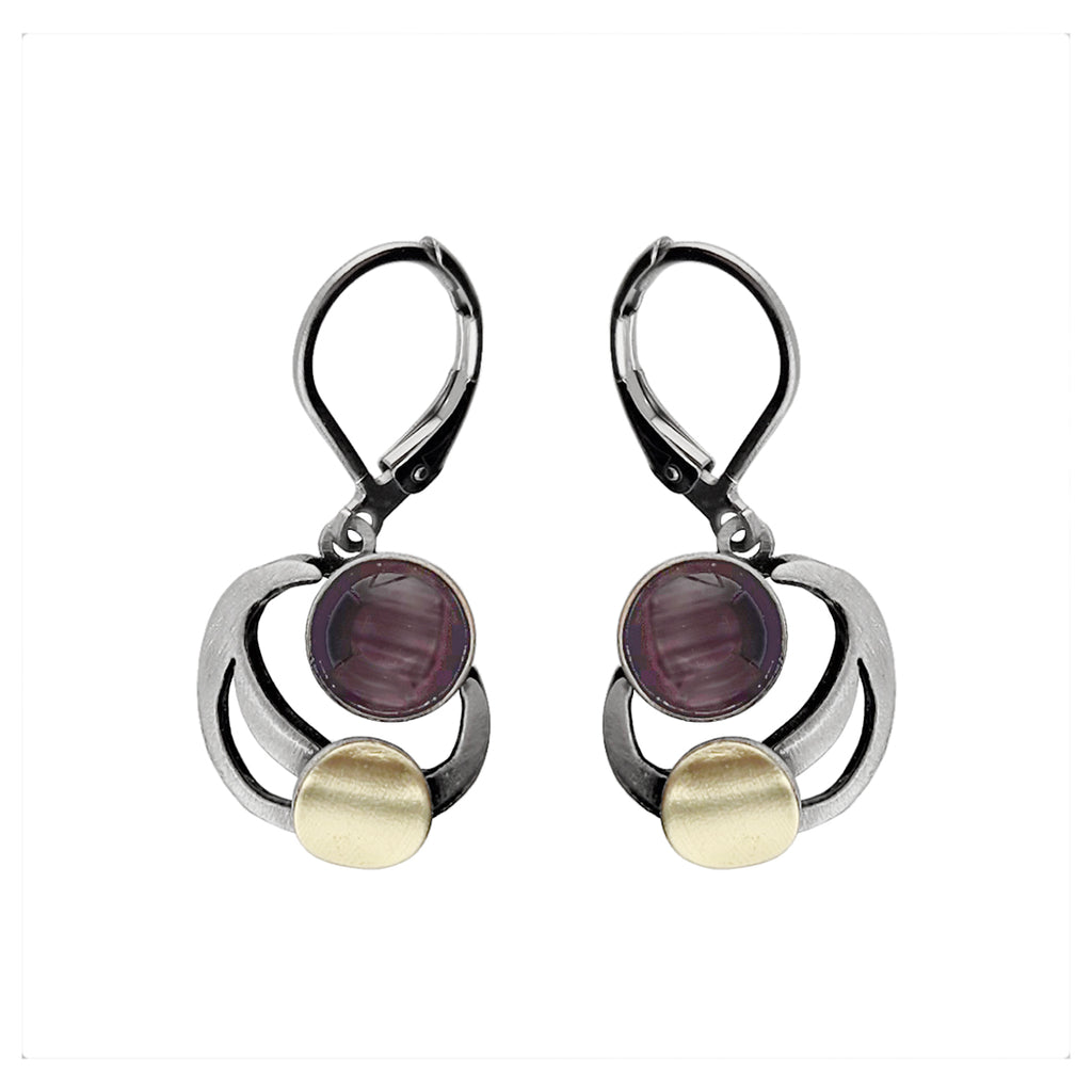 Two petite antiqued concentric silver circles orbiting a purple glass cabochon accented with folded golden petal. Lever back wires. Uniquely sophisticated hand made artisan jewelry designed and created in Montreal by Christophe Poly of Crono designs.