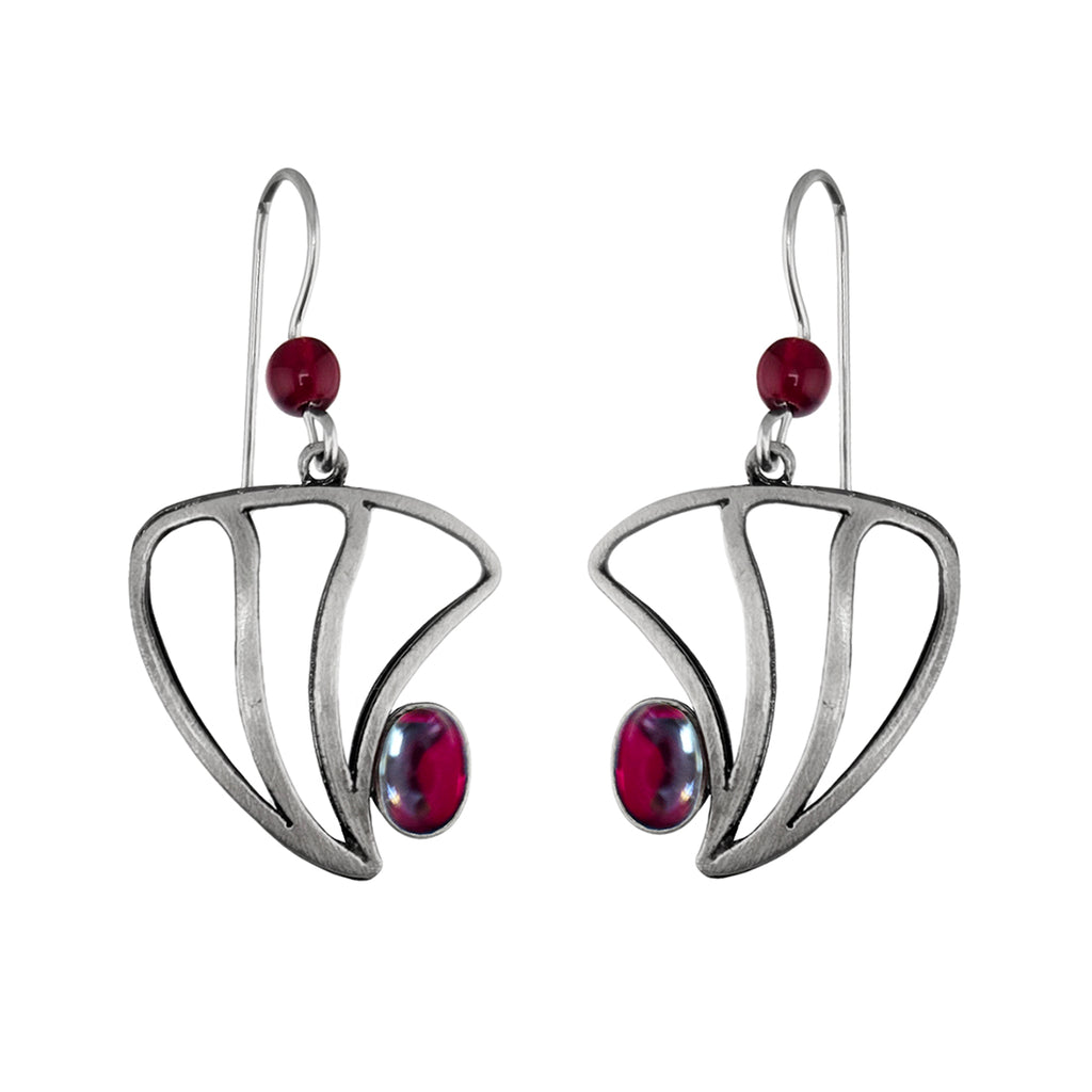 These earrings feature open butterfly wings crafted from Antiqued brushed silver, enhanced by a striking red oval glass cabochon and a complementary round glass bead. Lightweight, easy to wear. Uniquely sophisticated artisan earrings created in the Montreal studio of Christophe Poly.