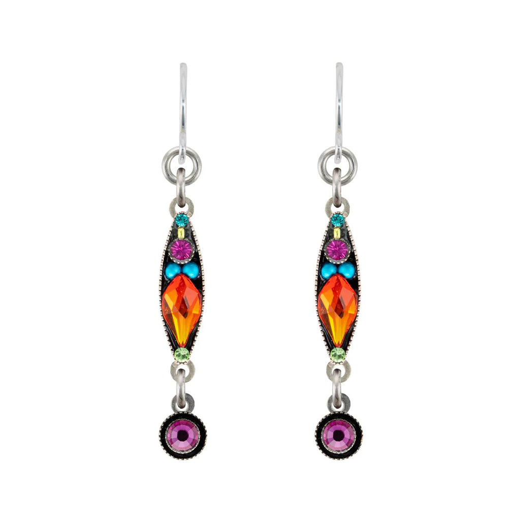 These slender earrings feature a linear mosaic design with vibrant faceted sunset Swarovski Crystal accented with petite round pink crystal drop. Firefly's signature intricately embellished mosaics designed by Juan Carlos Chavajay Vasquez and created by skilled artisans in the Guatemala workshop.