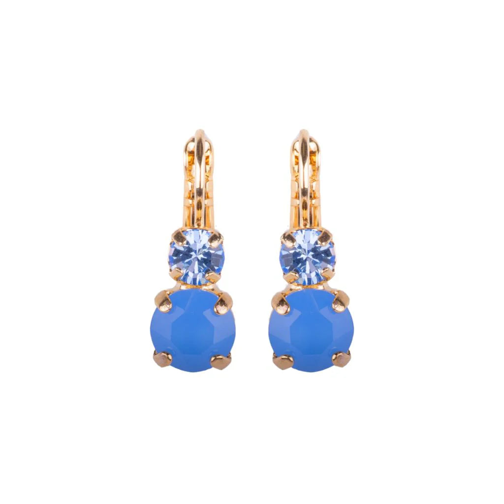 These sophisticated earrings pair a petite round cut Light Sapphire crystal with a larger Carolina Blue Opal stone, both meticulously faceted and individually secured in bright gold prong settings. The layered composition of complementary blue tones delivers refined sparkle and depth, establishing a versatile piece with lasting appeal. Mariana designs her jewelry to spiritually uplift the wearer with good energy. Her fusion of old and new, color and spirit is visible in all her designs. Created by Mariana with color and joy in Israel.
